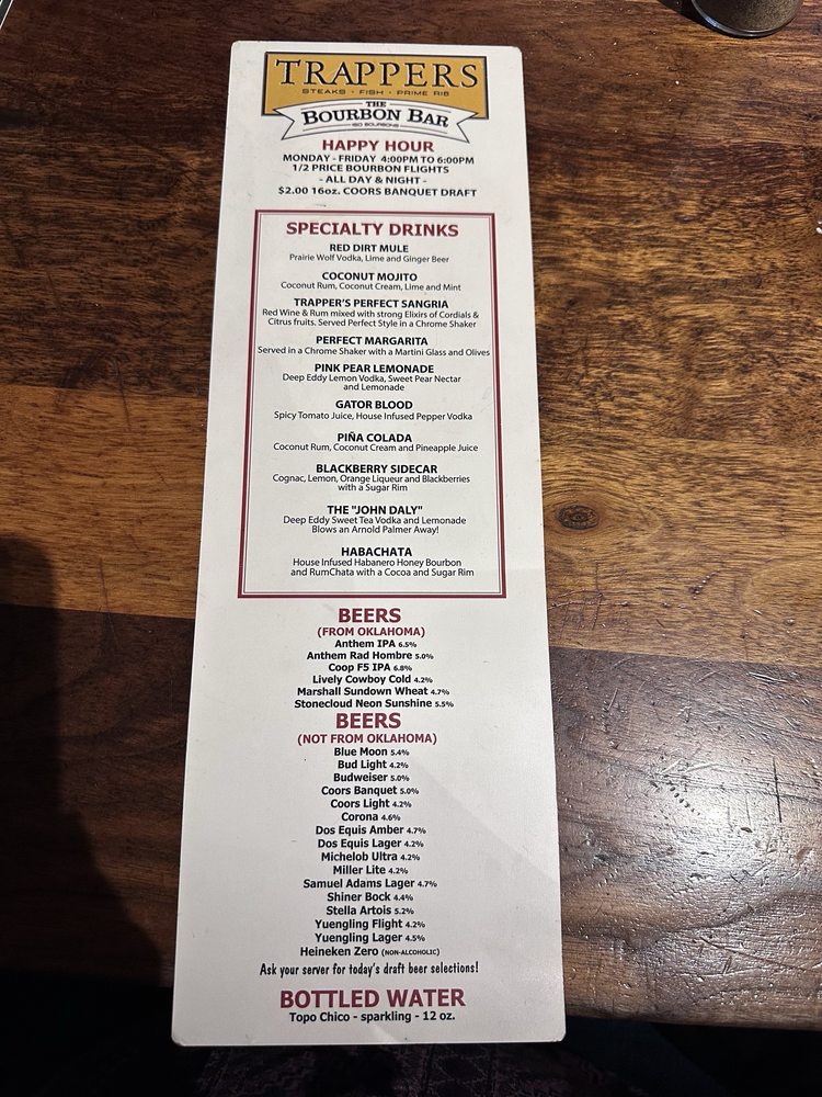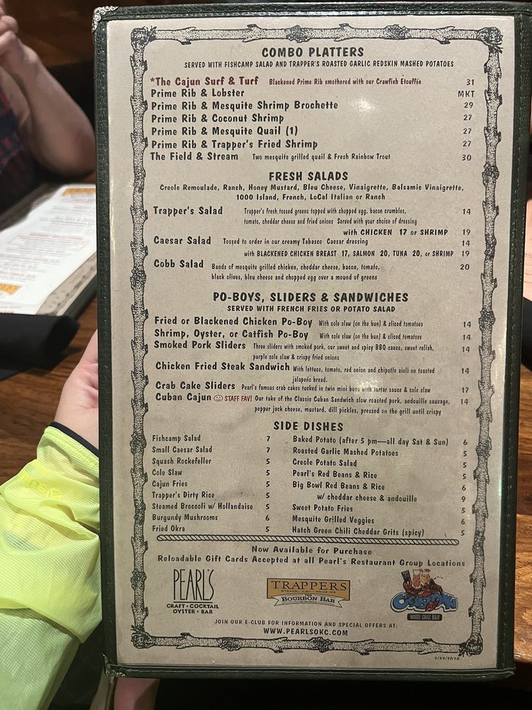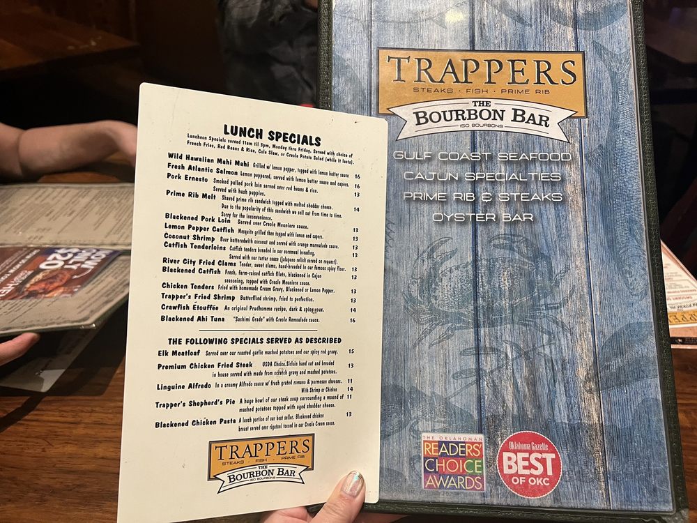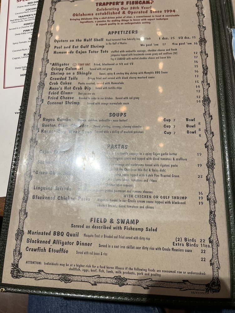 Trapper's Fish Camp in Oklahoma City offers a warm Cajun-Creole ambiance with a diverse seafood menu. Known for its consistent excellence, the restaurant provides delivery, takeout, and catering services. Customers praise the flavorful dishes, like the blackened prime rib and Cajun pasta, complemented by sides like garlic mashed potatoes and cole slaw. The fried gator bites and Okie Ponchartrain are highly recommended starters. The attentive service enhances the dining experience, with friendly staff and a relaxed atmosphere. The rustic decor adds to the charm of Trapper's, making it a go-to spot for a delicious meal. Don't miss out on the Happy Hour specials and outdoor seating options for a truly enjoyable dining experience.